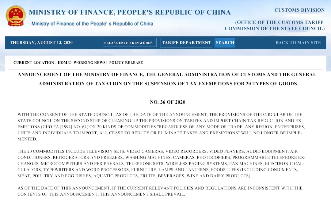 Recently, the Ministry of Finance, the General Administration of Customs, and the General Administration of Taxation issued Announcement No. 36 of 2020, deciding to stop implementing the 20 commodities ceasing tax exemption regulations, i.e., reinstating the tax exemption regulations for these 20 commodities.
