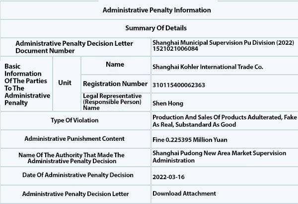 Shanghai Municipal Administration of Market Supervision hjemmeside annoncerede for nylig den administrative sanktionsbeslutning (Shanghai kommunale tilsyn Pu Branch [2022] 152021006084) viser, at Shanghai Kohler International Trade Co., Ltd. har produktion og salg af produkter, der er forfalsket, falsk som ægte, substandard som god ulovlig adfærd. Shanghai Pudong New Area Market Supervision Administration idømte det en bøde 0.225395 millioner yuan, og strafdatoen var marts 16, 2022.