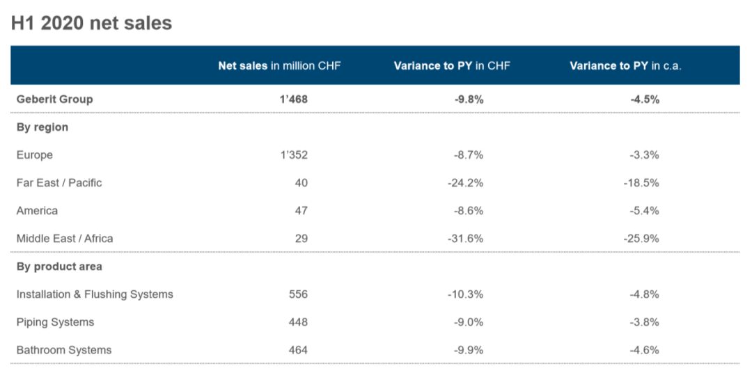 According to Geberit’s first-half report released on July 6, 2020, January-June, Geberit achieved sales of CHF 1.468 billion (about RMB 11.217 billion), down 9.8%, of which Europe and the United States decreased by 8.7% and 8.6% respectively, the Far East and the Pacific, the Middle East and Africa fell by as much as 24.2% and 31.6%. .