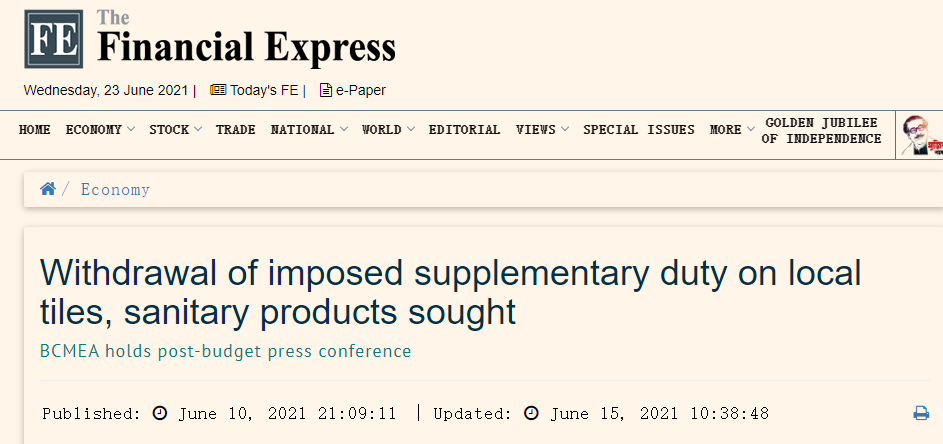 According to the Financial Express, Lub Bangladesh Ceramic manufacturers thiab cov neeg xa khoom ua ke (BCMEA), in a press conference on the national budget for the new fiscal year (2021-2022), raised the demand for higher tariffs on imported foreign tiles and sanitary ware to protect the local industry.