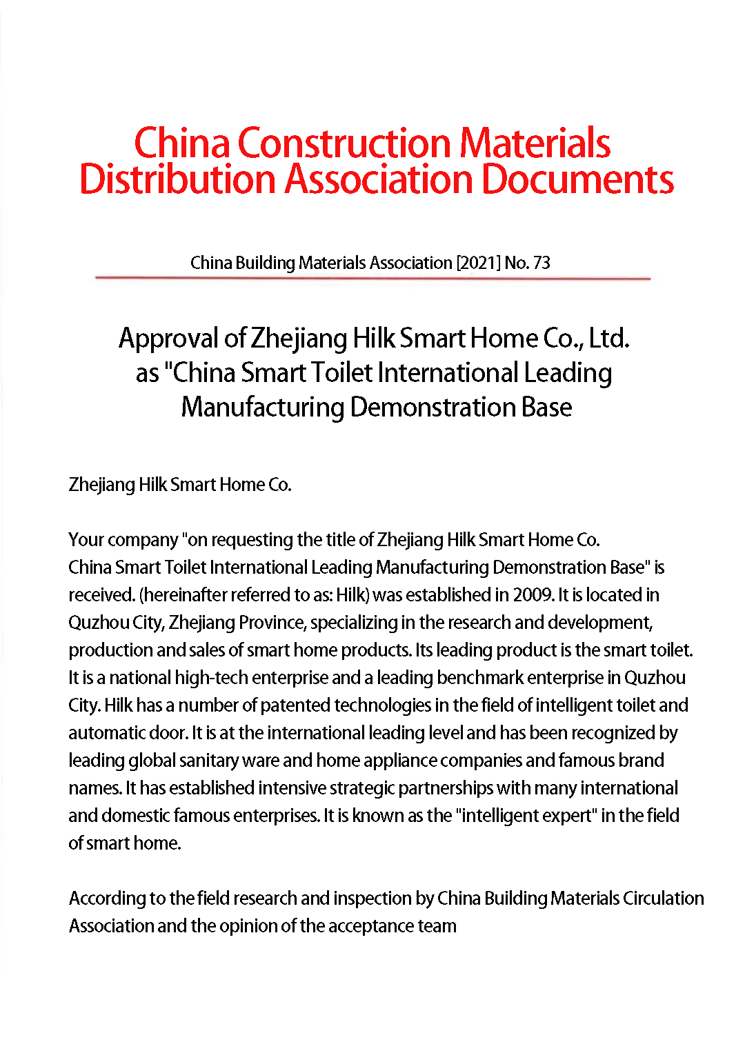 On September 3, China Building Materials Circulation Association issued an approval to award Hilk Smart Home Co. “Department of Circulation Industry Development of the Ministry of Commerce of the People’s Republic of China”, “Law Enforcement Inspection Bureau of the State Administration of Market Supervision and Administration”, “Party Building Work Bureau of the State-owned Assets Supervision and Administration Commission of the State Council “. This marks the Hilk International Smart Home Manufacturing Base as the smart manufacturing benchmark of China’s smart toilet industry.