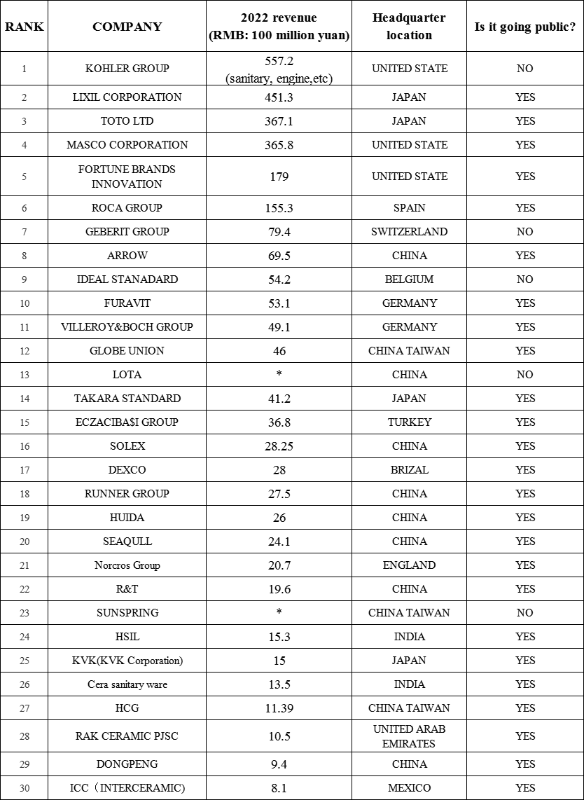 កំពូល 30 global sanitary ware companies (Statistical basis: Enterprise sanitary ware business revenue)
