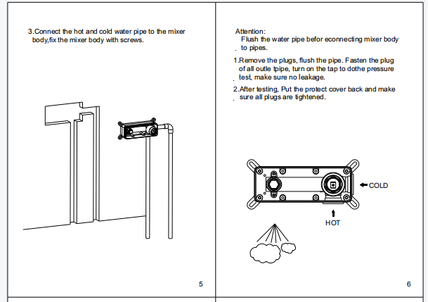 5. Connect the hot and cold water pipes, Hot and cold water pipes should be connected to the embedded box in the correct position.