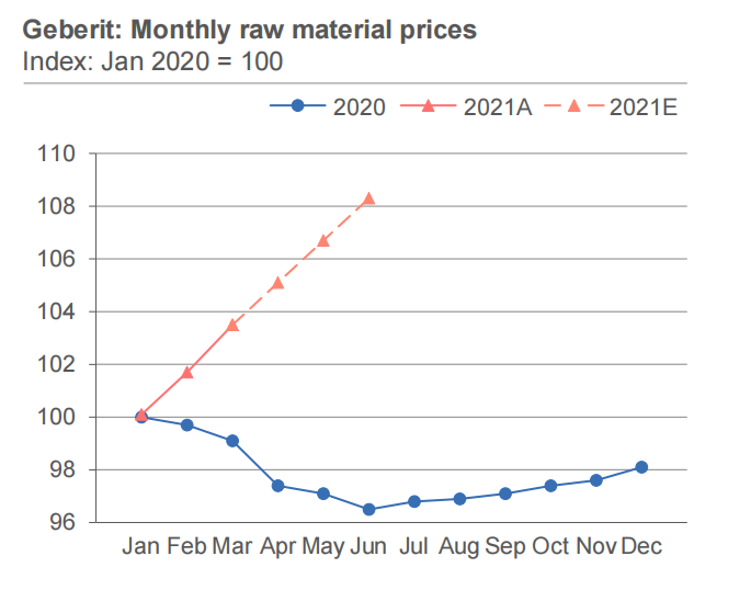 Geberit also stated in the financial report that the increase in raw material prices has not yet had a major negative impact on the company’s operations. എന്നിരുന്നാലും, Geberit has listed the raw material price index from 2020 to the present, indicating that the current price index has risen to more than 103 points and has been below 100 points in 2020. Geberit said that the increase in raw material prices will begin in December 2020 and is expected to increase by 5% in the second quarter of 2021 from the first quarter.