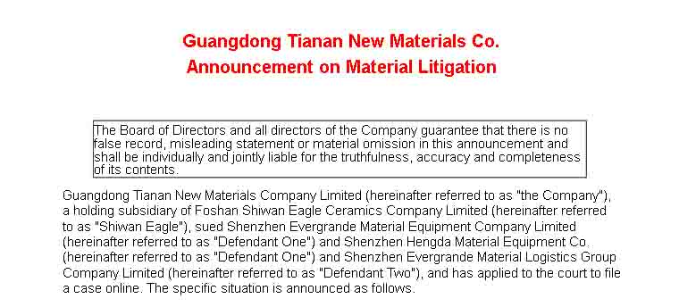 Ltd. (ntawm no xa mus ua “Tianan New Material”) issued an announcement, disclosing the case: its holding subsidiary – Foshan Shiwan Eagle Ceramics Co, Ltd (ntawm no xa mus ua “Dav dawb hau Ceramics”) sued Shenzhen Evergrande Material Equipment Co and Shenzhen Evergrande Material Logistics Group Co Ltd (ntawm no xa mus ua “Evergrande Material Logistics”).
