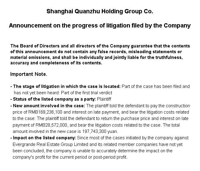 In January 2022, Quanzhu issued an announcement that the company and its wholly-owned subsidiary Shanghai Quanzhu Decoration Co., Ltd. had filed lawsuits with Evergrande Real Estate Group Co. and its relevant member enterprises in matters of disputes over payment for construction works and disputes over housing sales and purchase contracts in various courts. Since the company’s previous disclosure of “Announcement on the Company’s Filing of Lawsuits to Evergrande and its Related Member Enterprises” to January 28, 2022, the company has successively received additional “Notice of Acceptance of Cases” from the court regarding 134 lawsuits.