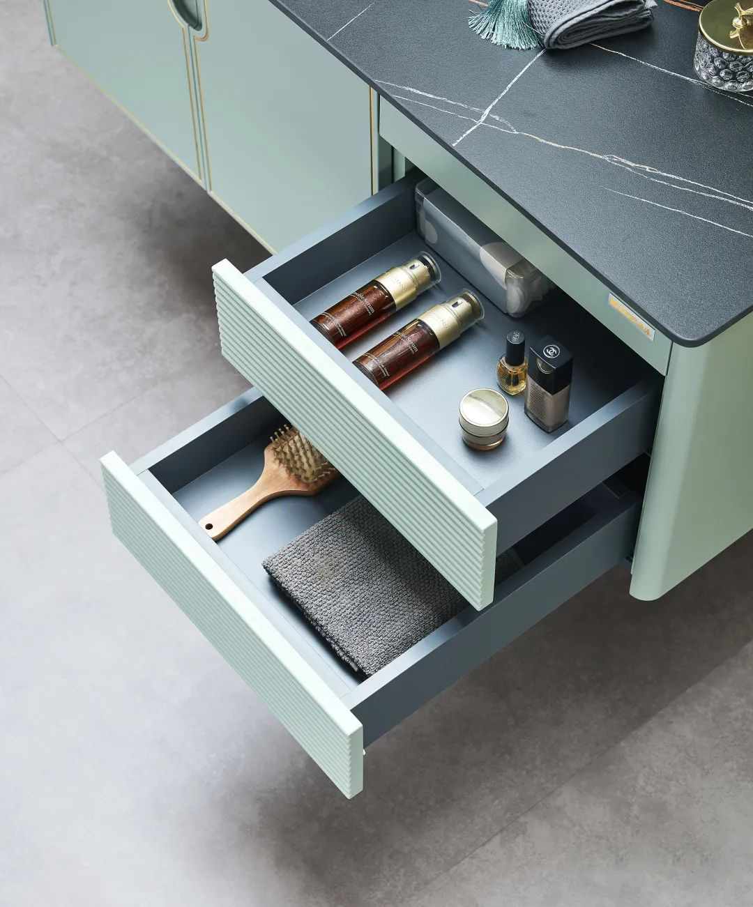 Large capacity storage cabinet. This cabinet can accommodate large toiletries. The drawers can hold small items that are commonly used. This allows for scientific partitioning and fine storage, thus keeping the bathroom neat and organized.