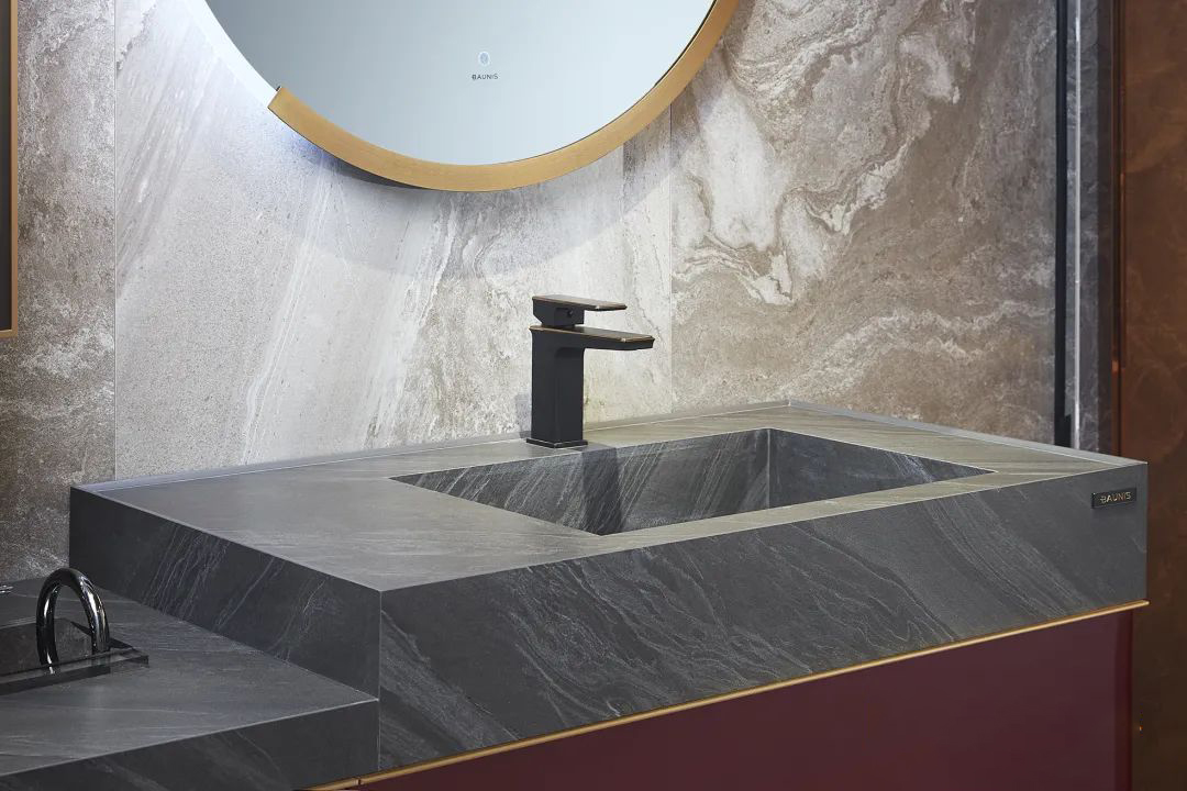 The textured rock slab replicates the natural stone texture and brings the natural language into the modern space. For the seamlessly connected rock slab integrated basin, the sewage on the countertop can be cleaned in one sweep. You no longer have to worry about hiding dirt and grime.