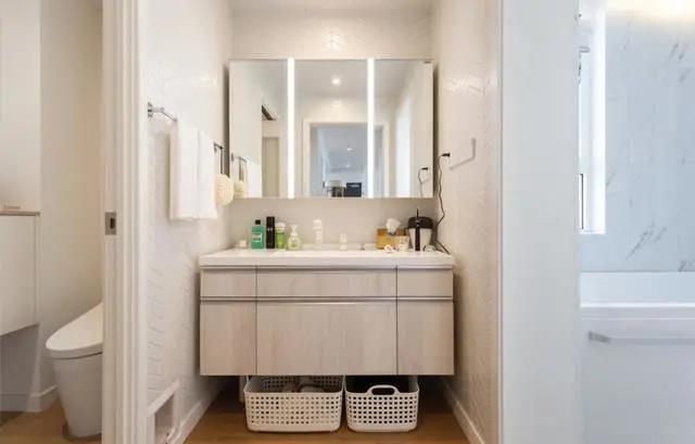 The bathroom cabinet hangs 30 cm in the air, which is better to clean than leaving a small gap. You can also put storage baskets at the bottom, and the whole is not bulky. ਜ਼ਰੂਰ, if you do this, it is best to make the toilet drain as a wall drain, so that the bottom will not expose the ugly drain pipe.