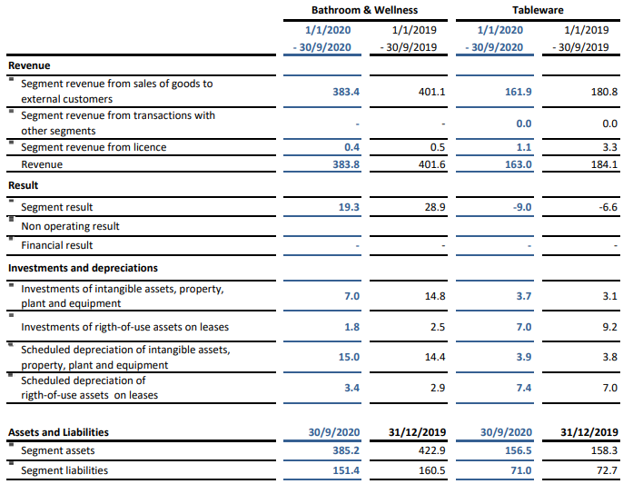 The tableware division’s results in the third quarter were also “very encouraging,” in the words of Villeroy & Boch. Sales rose by 8.0% year-on-year to €69 million, resulting in an 11.5% decline in sales for the first three quarters of the year, better than the 21.7% decline recorded in the first half of the year, and bringing the division’s sales to €163 million for the first three quarters of the year.