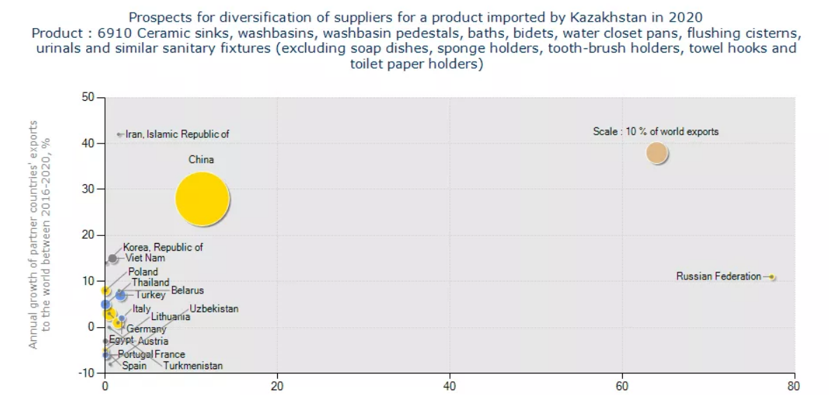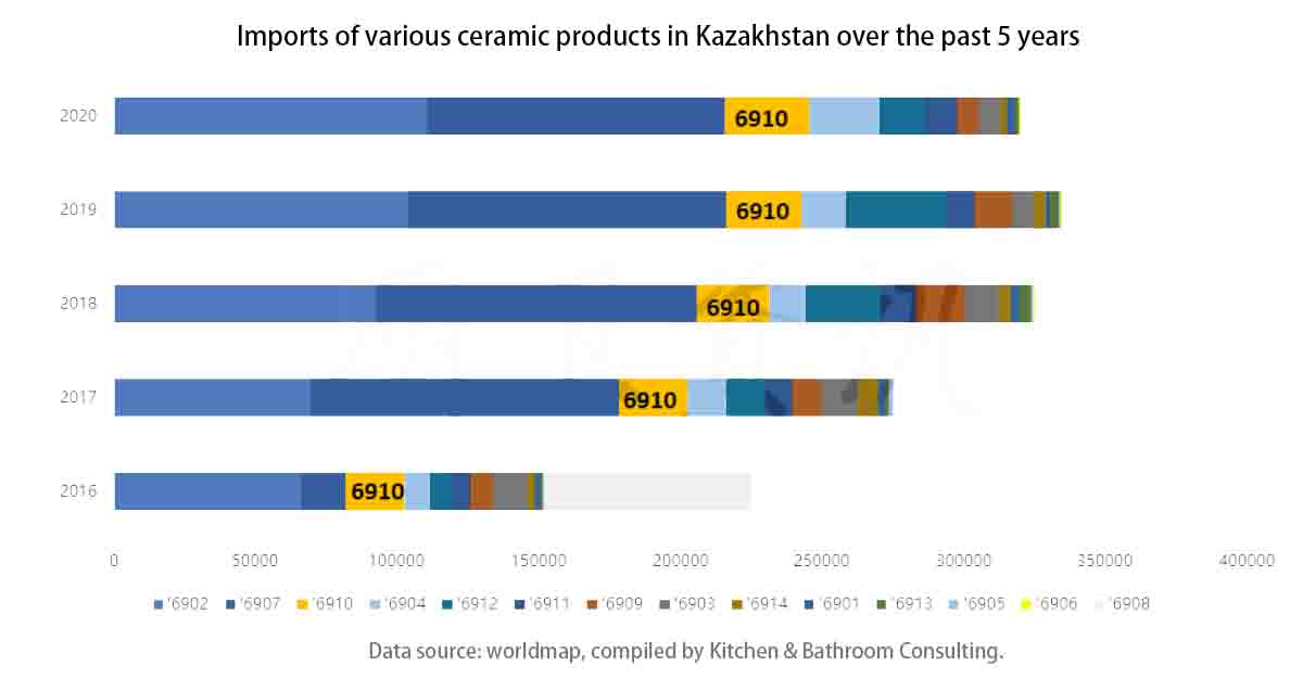 Kwa 11 categories such as insulation materials, profiled panels, and plastic pipes, local enterprise capacity can only provide a 50% supply. Kwa 3 categories such as waterproofing, wallpaper, and sanitary ware, the local production capacity was 0. The supply of local sanitary ware was mainly based on imports. According to the data obtained from Kitchen & Umwagaji, kutoka 2016 kwa 2020, Kazakhstan’s imports of sanitary ware (6910) are US$20,979,000, US$24,264,000, US$25,738,000, US$26,669,000 and US$29,683,000 respectively. China is the largest source country for Kazakhstan’s sanitary ware imports. Katika 2018-2020, China’s exports of sanitary ceramics (6910) to Kazakhstan amounted to USD 2,419 thousand, USD 2,593 thousand, USD 3,342 thousand respectively.