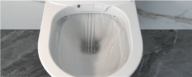 Prevista Shower Toilet More has a pre-wetting function that automatically sprays water to wet the ceramic surface of the toilet wall when the user is seated, forming a water film on the ceramic surface, making it less likely for dirt to adhere and easier to flush clean without residue.