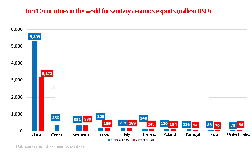 In addition, according to the Turkish Ceramic Association data show that the data for the 1-3 quarters of 2019-2020, for example, the world’s top 10 sanitary ceramics exports are China, Mexico, Germany, Turkey, Italy, Thailand, glass, Portugal, Egypt, the United States. And the top 10 importing countries are the United States, Germany, France, Britain, Canada, Spain, the Netherlands, South Korea, Australia, Japan.