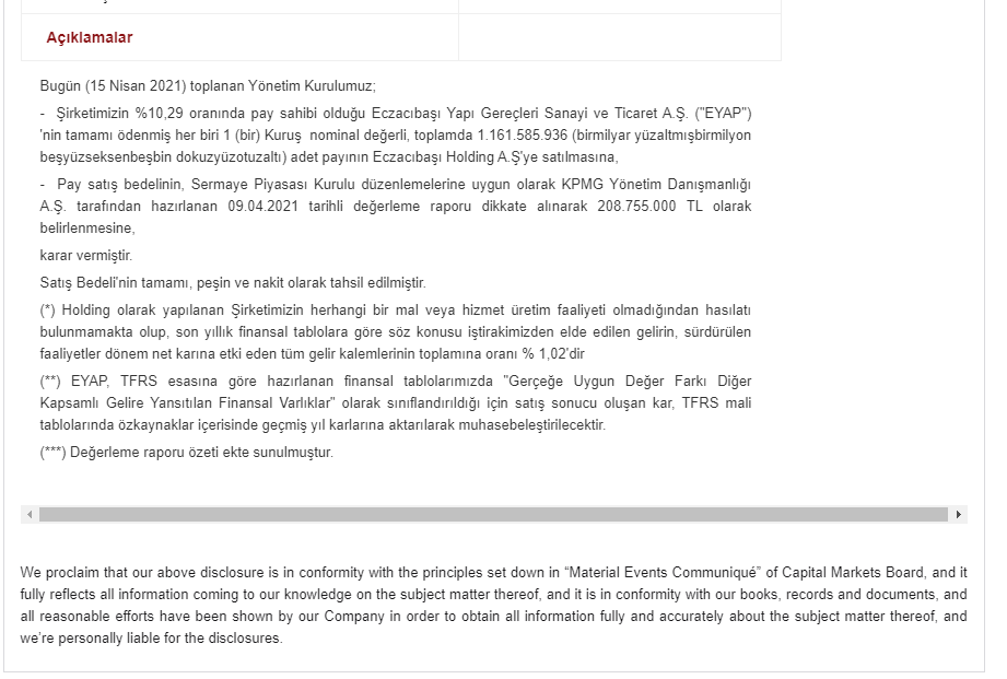 On April 15, Turkey’s largest sanitary ware manufacturer and exporter ECZACIBAŞ YAPI GEREÇLERİ (“EYAP”) sold 10.29% of its shares to its holding subsidiary Eczacıba Holding A.Ş for a cash consideration of 208, The cash consideration was 208,755,000 Turkish Liras (RMB 169 million).