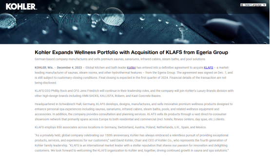 On December 4, Kohler announced the acquisition of sauna and steam room manufacturer KLAFS from the Egeria Group. The transaction is expected to be completed in the first quarter of 2024, and the transaction amount is undisclosed.